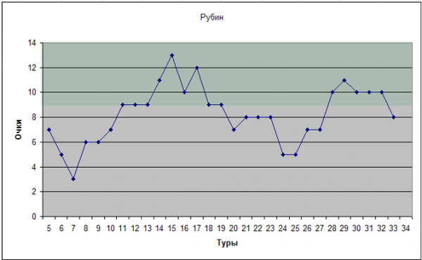 Казанский клуб имеет самый неоднозначный график, чем-то схожий с графиком Динамо. В принципе нельзя не отметить, что команда держится в районе «зеленой зоны», имея постоянно по 8-10 очков за 5 туров с небольшими перепадами, но такое скромное постоянство, без рывков вверх, но с периодическими движениями вниз, вряд ли позволит Казани серьезно побороться за 1-2 места. А вот в зону Лиги Европы – всегда пожалуйста!