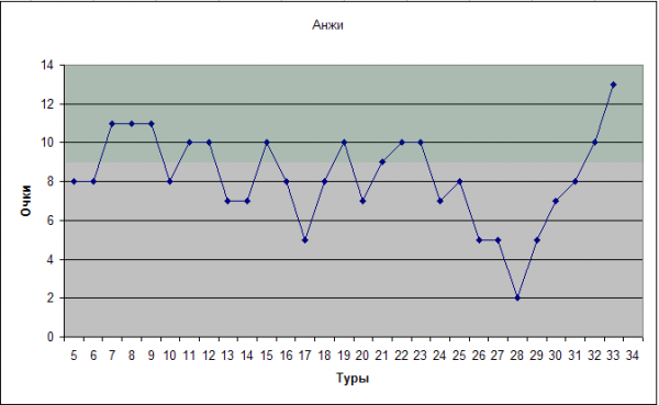Команду, как видно, бросает по ходу сезона то в жар, то в холод, причиной чего стали постоянные передряги в руководстве клубом, перестановки на тренерском мостике, скандалы с бананами и Красножанами, ну и, конечно, несыгранность и разношерстность коллектива. И тем не менее, достигнув минимального показателя в 2 очка за 5 туров (рекорд среди команд семерки) минимума, Анжи за счет чрезмерного желания и исполнительского мастерства отдельных лиц некавказской национальности начал набирать очки. И вот махачкалинцы имеют самый резкий рывок вверх среди всех команд первой семерки. Смогут ли они остаться на вершине, ведь вроде с приходом голландского волшебника в клубе наконец все устаканилось, состав выравнивается и сыгрывается, или же это все временное улучшение перед «кончиной» увидим совсем скоро. В Махачкалу едет следующий проверяющий – разбежавшийся Спартак.