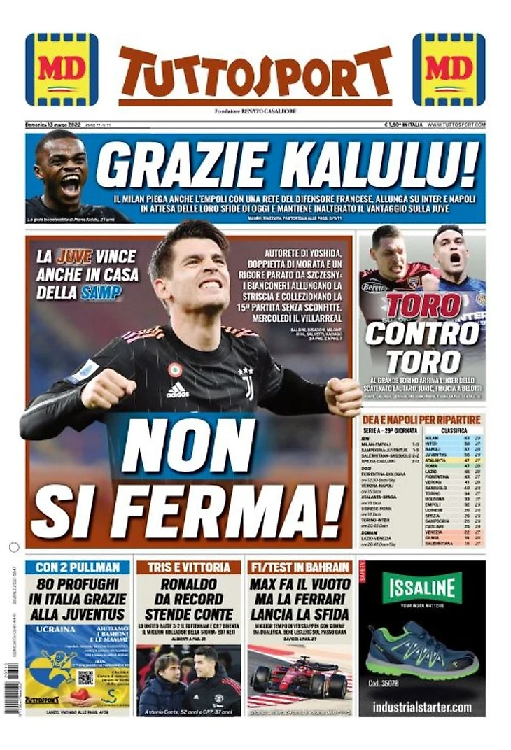 TuttoSport также дал оптимистичный заголовок «Не остановить!» о победе Бьянконери: «Юве» выиграл также в гостях у «Самп». Автогол Йосиды, дубль Мораты и пенальти, взятый Шченсны: Бьянконери продлили серию и собрали 15-ый матч без поражений. В среду – «Вильярреал».