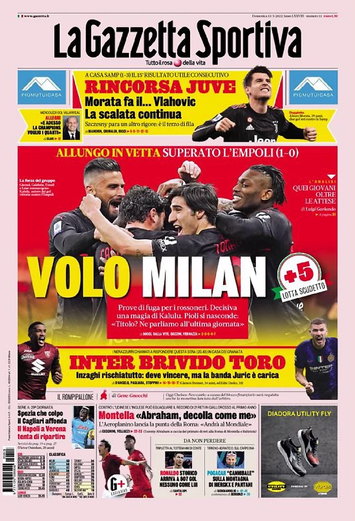 «Полёт «Милана» – такой заголовок Gazzetta посвятила победе Россонери: «Отдалились на вершине, обыграв «Эмполи» (1:0). Попытка отрыва для Россонери. Всё решило волшебство от Калулу. Пиоли скрывается: «Титул? Поговорим об этом в другой день».