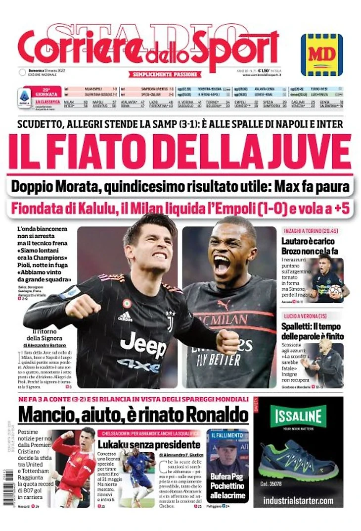 «Дыхание «Юве» – таким заголовком Corriere отметила успех Бьянконери: «Скудетто, Аллегри остановил «Самп» (3:1): он за спиной «Наполи» и «Интера». Дубль Мораты, пятнадцатый положительный результат: Макс внушает страх. Волна Бьянконери не останавливается, но тренер тормозит: «Мы далеки, время Лиги Чемпионов».