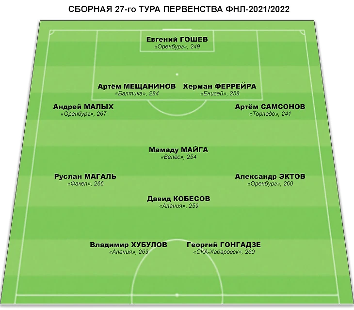 В этот раз больше всех, три игрока плюс тренер, делегировал в сборную тура «Оренбург». Двух футболистов «выделила» «Алания». В формировании сборной 27-го тура также поучаствовали «Балтика», «Енисей», «Торпедо», «Велес», «Факел» и «СКА-Хабаровск».