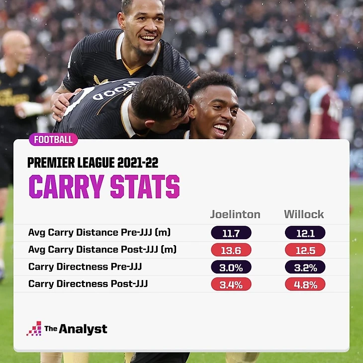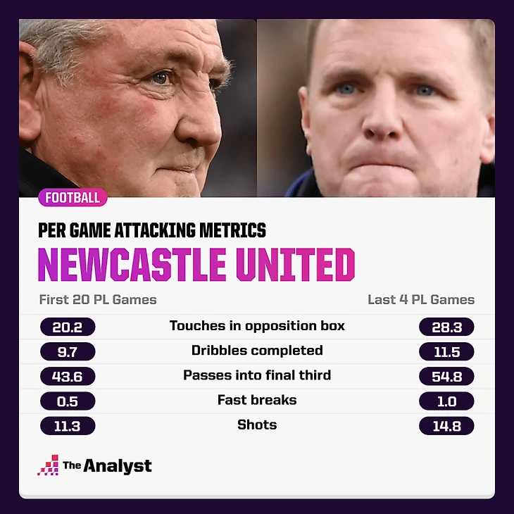 Уиллок и Жоэлинтон продвигают мяч, Триппьер и Берн держат высокую линию защиты, команда остается компактной – значит, соперники реже вступают в продвинутые зоны, в связи с чем улучшились защитные цифры «Ньюкасла». После реформ команда допускает меньше ударов (11,5 против 15,9) и ожидаемых голов (0,8 вместо 1,9). Кроме того, Хау улучшил статистику в атаке.