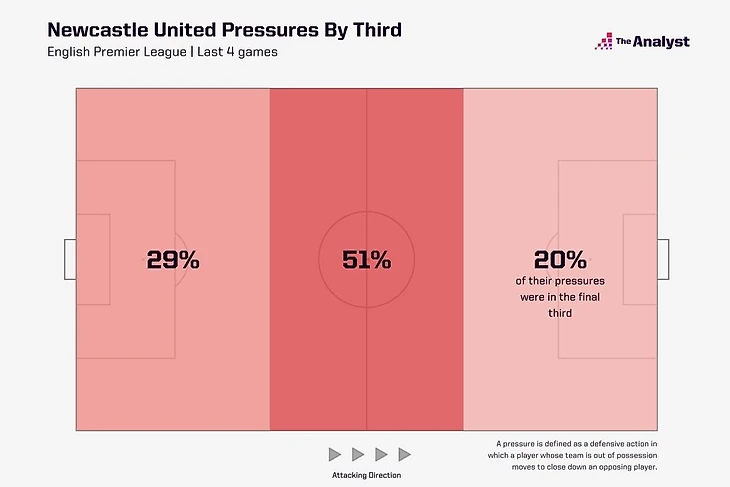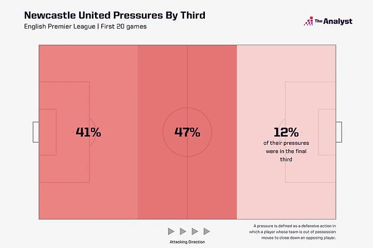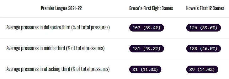 Первые несколько месяцев успехи Хау казались скромными. «Ньюкасл» провисал между стилями. С одной стороны, команда стала активнее защищаться. При Брюсе футболисты выдавали 15,5 прессинг-действий за игру, а с новым тренером показатель вырос до 19,8. Только большинство оборонительных активностей осталось в середине поля и защитной трети. Установить высокое давление Эдди не удавалось.