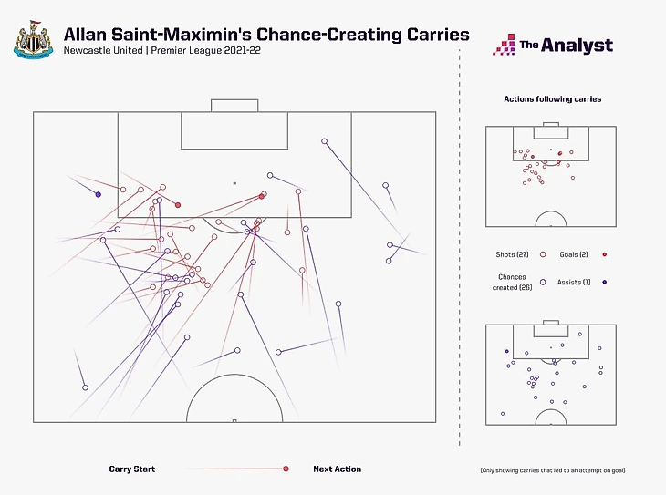Если «Ньюкасл» возвращает владение в центре, в дело вступает Сен-Максимен. В переходных фазах Аллан получает больше пространства. Француз занимает четвертое место в АПЛ-2021/22 по продвижениям с мячом за 90 минут (19). Средняя дистанция, на которую вингер протаскивает атаки, – 8,27 метров (лучший показатель в лиге). Дриблинг полузащитника принес команде 53 удара – вновь первый результат в чемпионате (второй – у Мохамеда Салаха с 53).