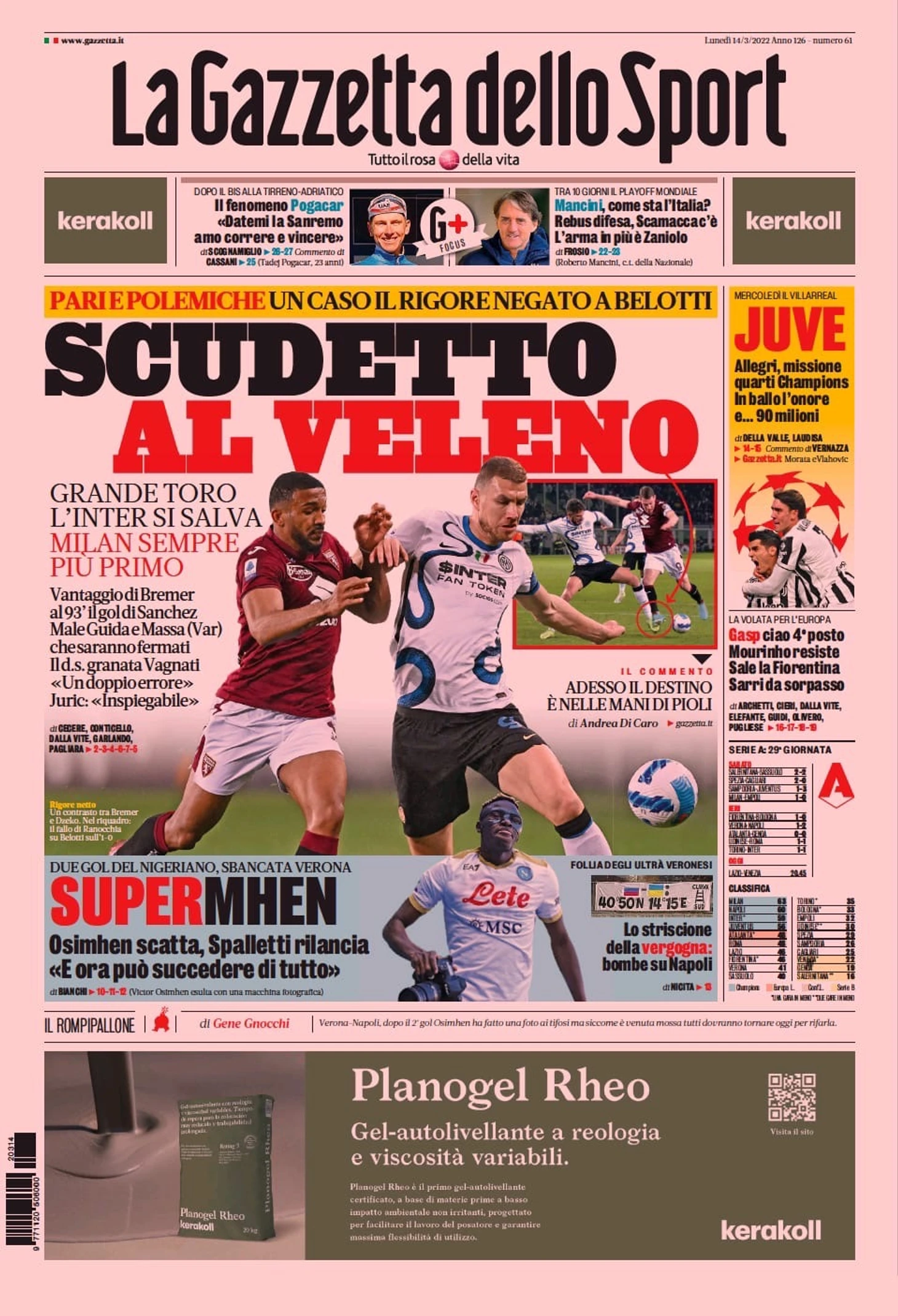 «Скудетто с ядом» – таким заголовком Gazzetta отметила ничейный результат в туринском матче: «Ничья и споры, проблема в не поставленном пенальти на Белотти. Отличный «Торино», «Интер» спасся. «Милан» всё более первый. После того, как Бремер вывел вперёд, на 93 минуте гол забил Санчес. Плохая работа Гуиды и Массы (ВАР), которые будут отстранены. Спортивный директор «гранатовых» Ваньяти: «Двойная ошибка». Юрич: «Необъяснимо».