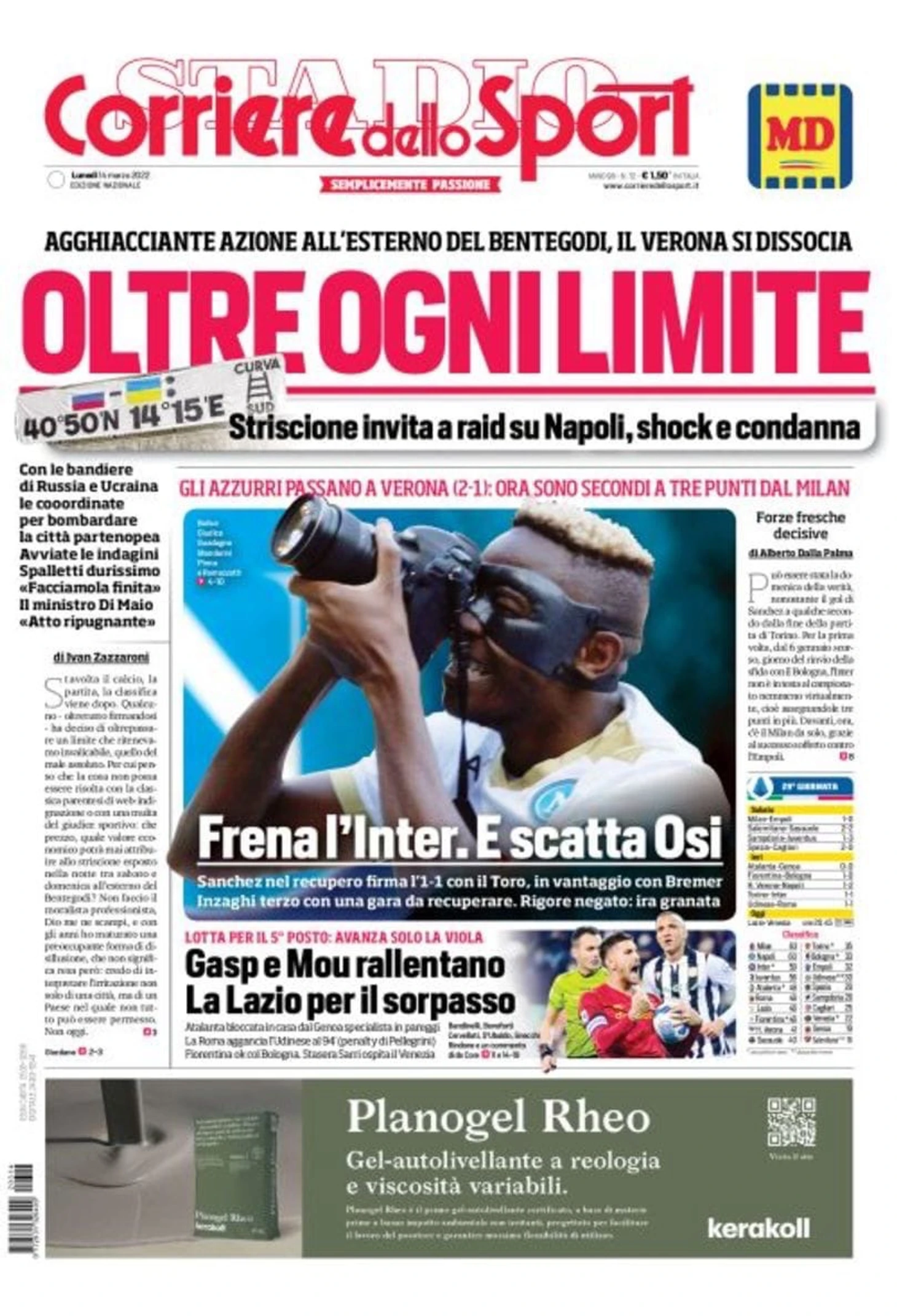 Corriere также упомянул не только о ничьей Нерадзурри, но и победе «Наполи» в заголовке «Остановлен «Интер». И включился Оси»: «Адзурри выиграли в Вероне (2:1): теперь они вторые в трёх очках от «Милана». Санчес в добавленное время принёс 1:1 с «Торино», вышедшим вперёд благодаря Бремеру. Индзаги – третий с игрой в запасе. Не поставили пенальти: гнев «гранатовых».
