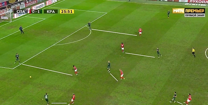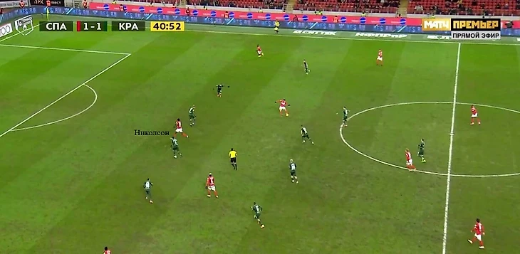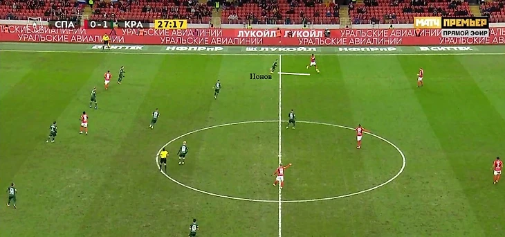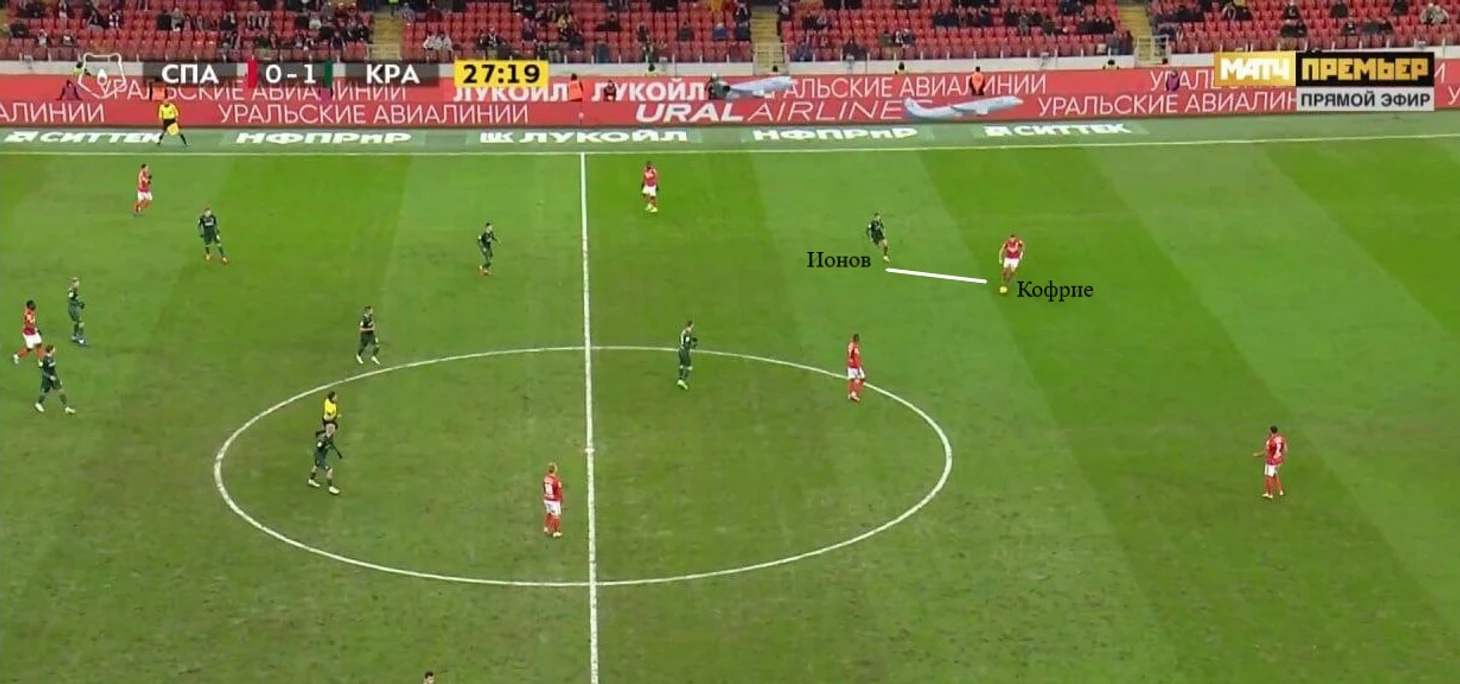 Прессинг включался в случае передачи назад на чужой половине. Например, Ионов встречал Мозеса на приеме, если нигериец отдавал на Кофрие, то Алексей продолжал движение на защитника «Спартака». Это касалось и передач назад на вратаря.