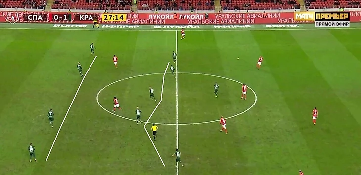 «Спартак» после матча с ЦСКА отошел от схемы 3-5-2 и против «Динамо» и «Краснодара» использовал формацию 3-4-2-1, напоминавшая при владении за счет смещений вглубь от Умярова и выдвижения вингбеков в среднюю линию 4-3-2-1.