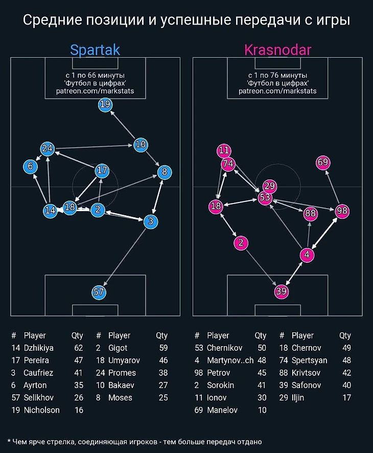 В целом, все продвинутые метрики говорят о том, что «Спартак» был гораздо опаснее, однако наблюдалось это не на всей дистанции матча. Девять ударов из штрафной из 12 хозяева нанесли во второй половине первого тайма. Игроки только привыкают к идеям Ваноли при владении, поэтому нестабильность в отдельных матчах естественна. Очевидно, оставшаяся часть сезона уйдет на адаптацию.