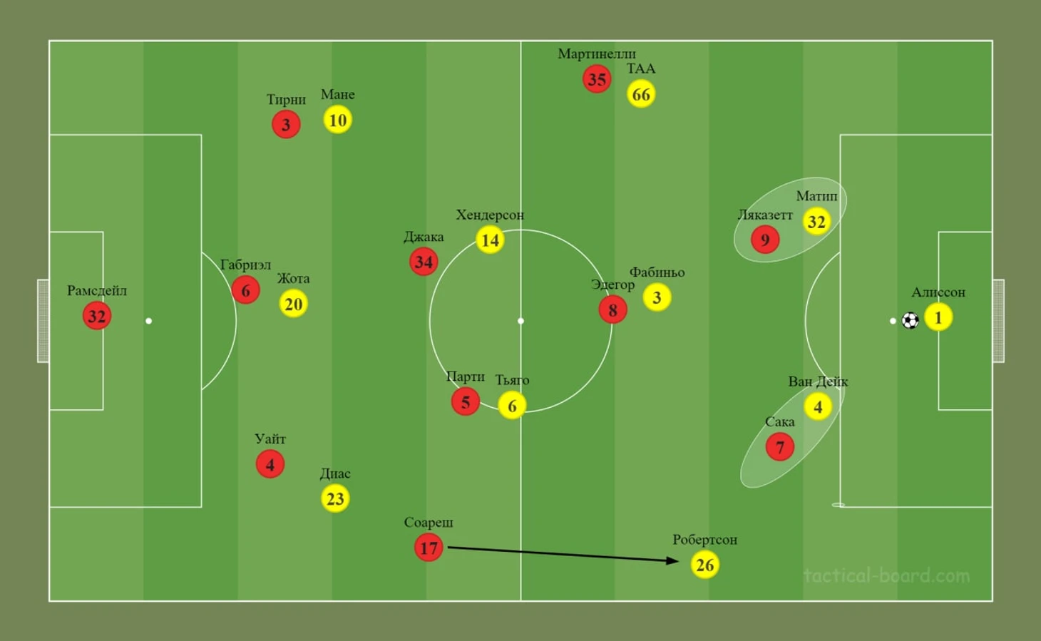 Первый тайм прошёл под эгидой взаимного высокого прессинга и борьбы за территорию. Все мы давно привыкли к высокому и агрессивному прессингу Клоппа, но Артета также решил не отсиживаться в обороне. После удачного по игре матча с «Сити» почему бы не попробовать запрессинговать и «Ливерпуль»? – подумал Артета. Получилось неплохо, потому что всю первую половину игры команды душили друг друга давлением и пытались найти лазейки в прессинге друг друга. Задумка Артеты была следующей: Сака и Ляказетт накрывают центральных защитников, Эдегор играет по Фабиньо, Мартинелли по Тренту, а к Робертсону поднимается Соареш – таким образом перекрывались все ближайшие варианты розыгрыша.