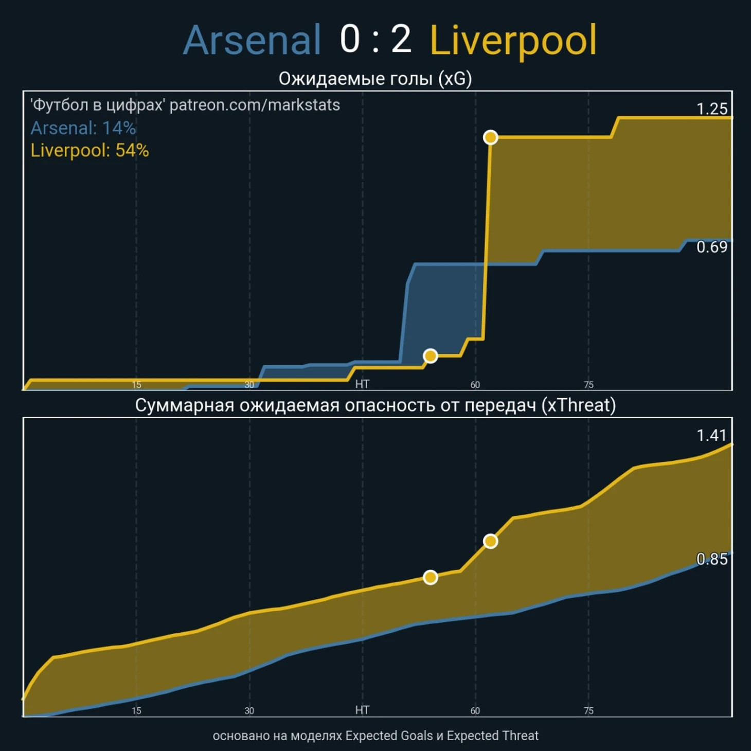 Ну и подводя итоги, надо сказать, что «Ливерпуль» заслужил победу, хотя матч и мог пойти по иному сценарию. Преимущество по xG (0.69 - 1.25), ударам из штрафной (3-7) создают картину, в которой команда Клоппа смотрелась убедительнее. Однако «Арсенал» провел также классный матч, особенно при 0:0 – план Артеты хорошо сдерживал «Ливерпуль» и создавал кое-какие шансы забить.