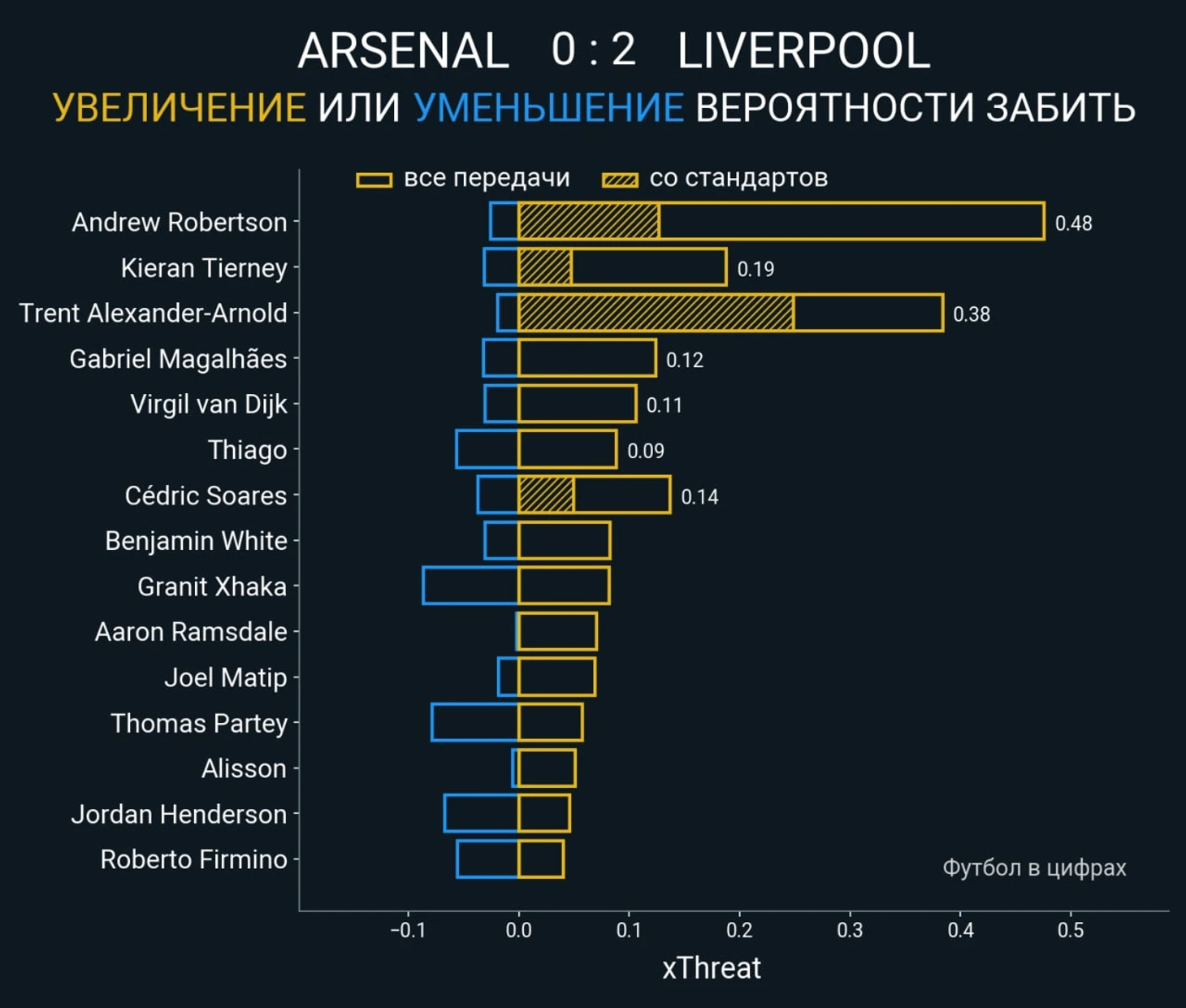 В этом матче не было явно лучшего игрока, но Робертсон проделал фантастическую беговую и плеймейкерскую работу. И дополнил все это ассистом на Фирмино. Он лидер по суммарной опасности передач с игры, при этом «Арсенал» 46% атак провел через его фланг – и провалов не было.