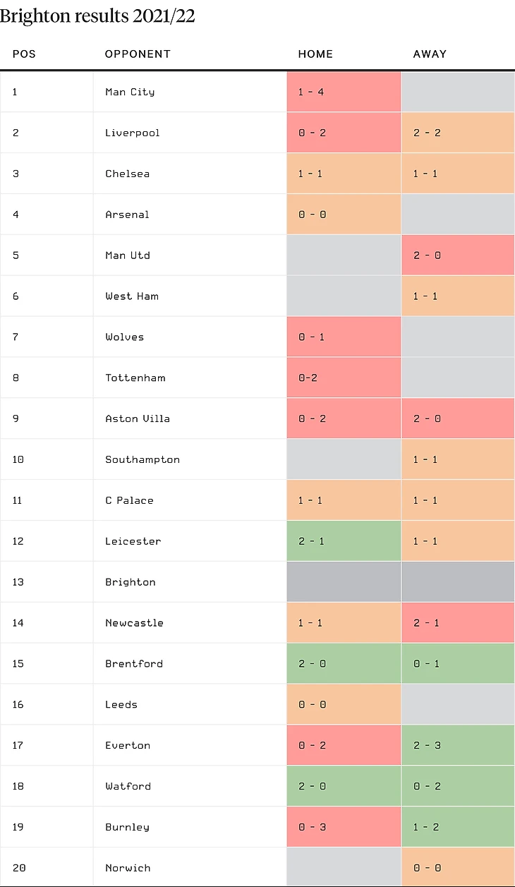Но это уже история. Возможно, более показательная картина возникает, когда вы рассматриваете результаты «Брайтона» по отношению к турнирной таблице в этом сезоне. Это говорит о многом и показывает, что «Брайтон», в некотором смысле, проводит сезон, противоположный прошлому.