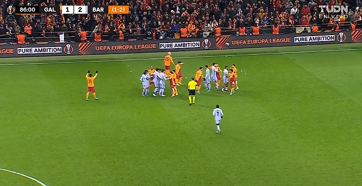 «Барса» потушила «Галатасарай» в Турции под летевшие с трибун стаканчики. Альба взбесился и пнул мяч к болельщикам