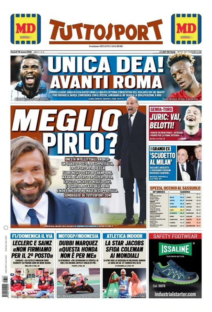 TuttoSport также хвалит команды в заголовке «Уникальная «Богиня»! Вперёд, «Рома»: «Лига Европы: Бога в гостях у «Байера» принёс четвёртую победу подряд «Аталанте», которая в четвертьфинале может найти «Барсу». Лига Конференций: с «Витессом» Абрахам на 90 минуте подарил квалификацию Мауру».