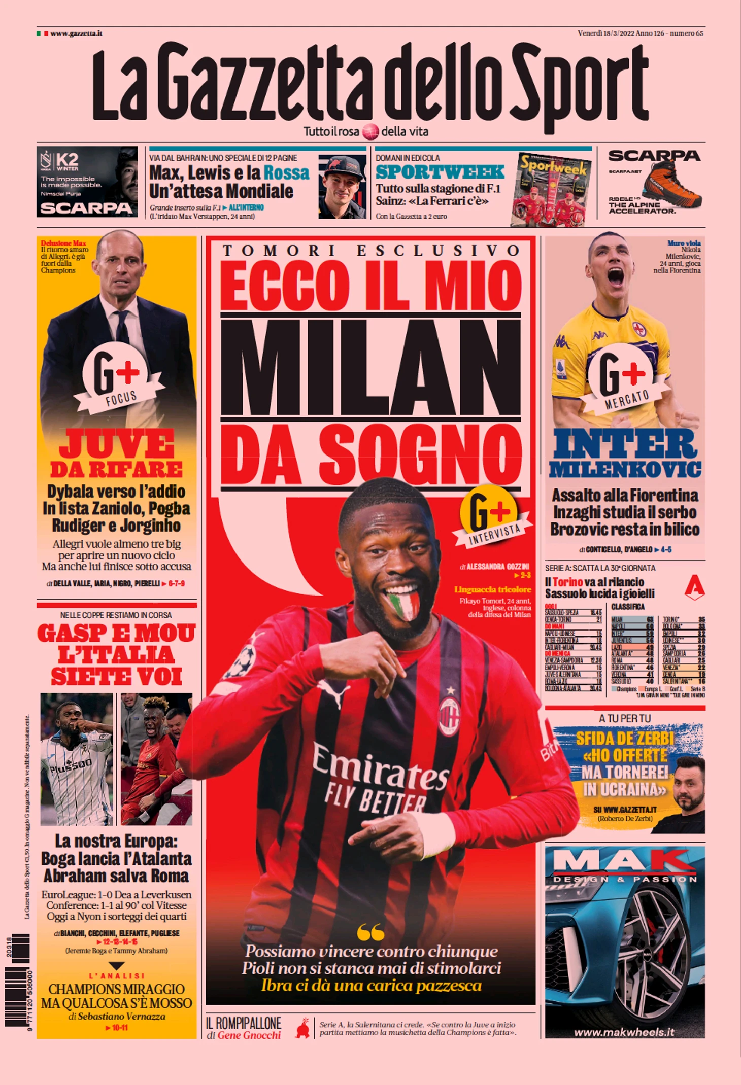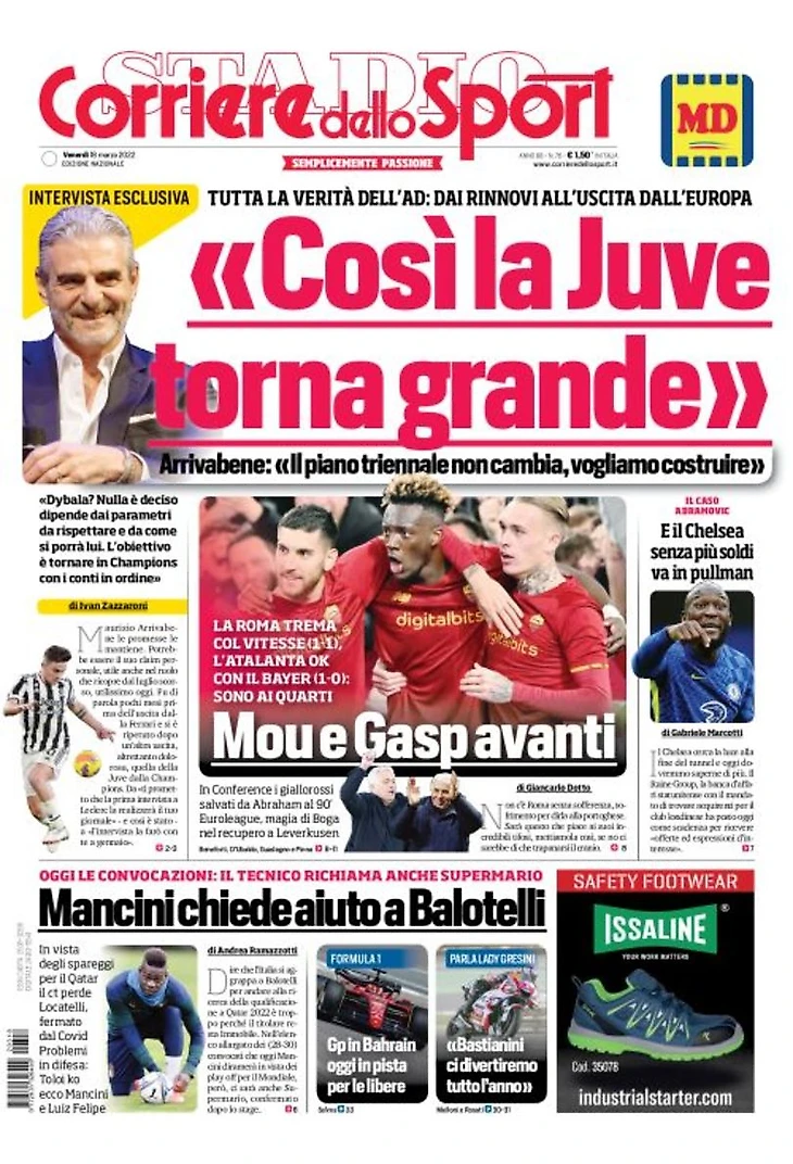 Gazzetta отмечает то, что «Аталанта» и «Рома» остались единственными итальянскими командами в Европе в заголовке «Гасп и Маур, Италия – это вы»: «Наша Европа: Бога запустил «Аталанту», Абрахам спас «Рому». ЕвроЛига: 1:0 «Богини» в Леверкузене. Лига Конференций: 1:1 на 90 минуте с «Витессом». Сегодня в Ньоне жеребьёвка четвертьфиналов».