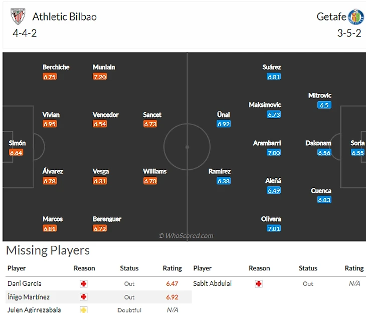 Что касается Хетафе, то из-за повреждений не поедут в Бильбао Максимович(6), Арамбарри(6,5) и Хонатан Сильва(5,5).