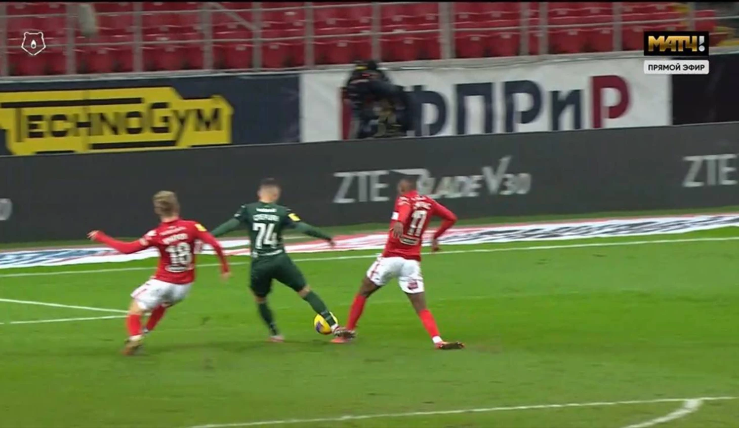 В перерыве арбитр объяснил почему: «Игрок очевидно играет в мяч и просто приземляется на ногу», – его объяснение из раздевалки, которое можно было подслушать в ТВ-трансляции.