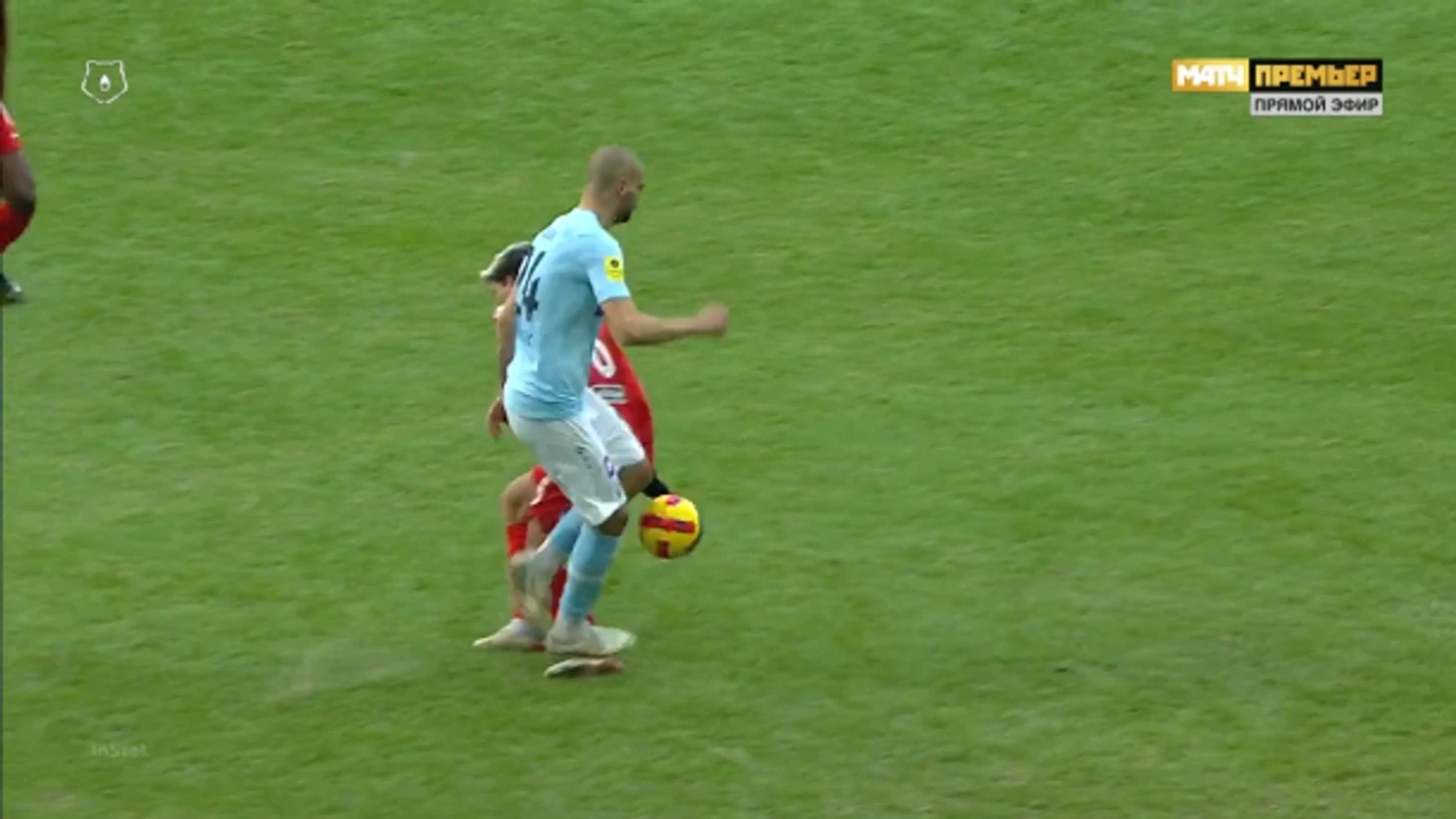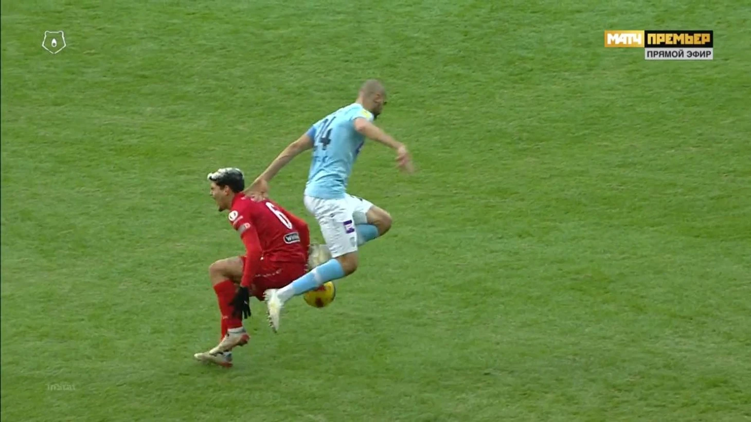 Гоцук проталкивает мяч и не просто задевает ногу Айртона, но и упирается в нее и отталкивается от голеностопа соперника.