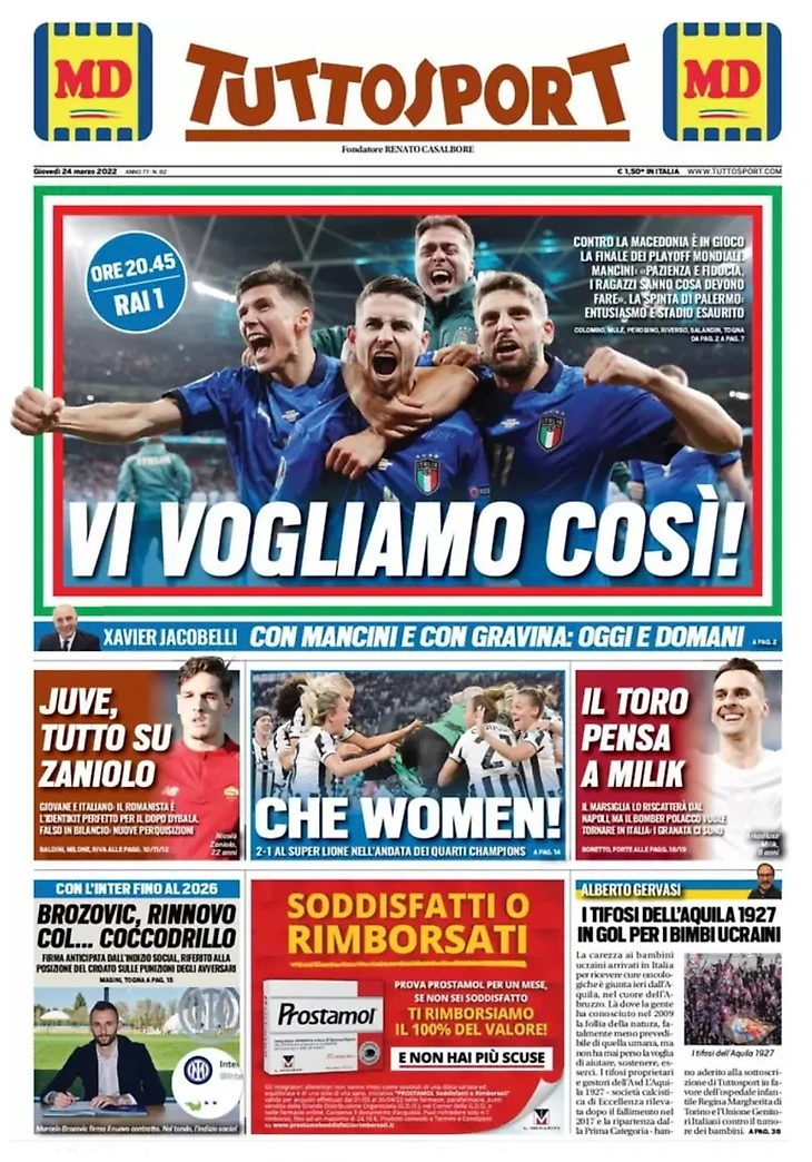 Сделайте Италию. Заголовки Gazzetta, TuttoSport и Corriere за 24 марта