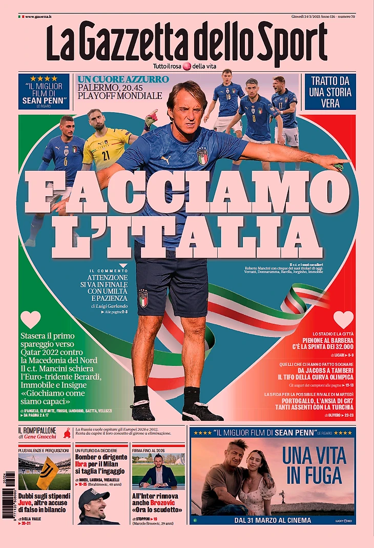 Схожий заголовок и у Gazzetta – «Мы делаем Италию»: «Лазурное сердце, Палермо, 20:45 (СЕТ), плей-офф Мундиаля. Этим вечером первый стыковой матч за поездку в Катар-2022 против Северной Македонии. Главный тренер Манчини выпускает евро-трезубец Берарди, Иммобиле и Инсинье: «Сыграем как умеем».