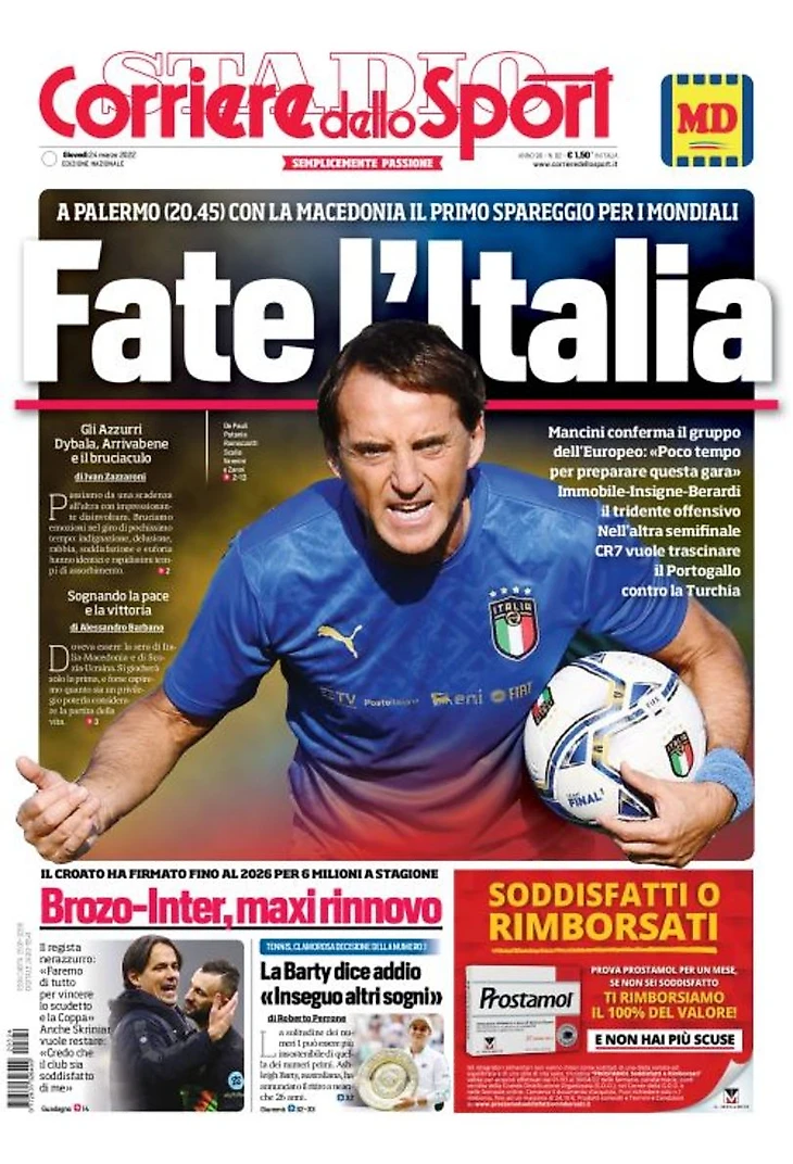 «Сделайте Италию» – таким заголовком Corriere предваряет сегодняшний матч Скуадры Адзурры: «В Палермо (20:45 CET) с Македонией первый стыковой матч за Мундиаль. Манчини подтверждает состав с Чемпионата Европы: «Мало времени, чтобы подготовиться к этой игре». Иммобиле-Инсинье-Берарди – атакующий трезубец. В другом полуфинале CR7 хочет тащить Португалию против Турции».