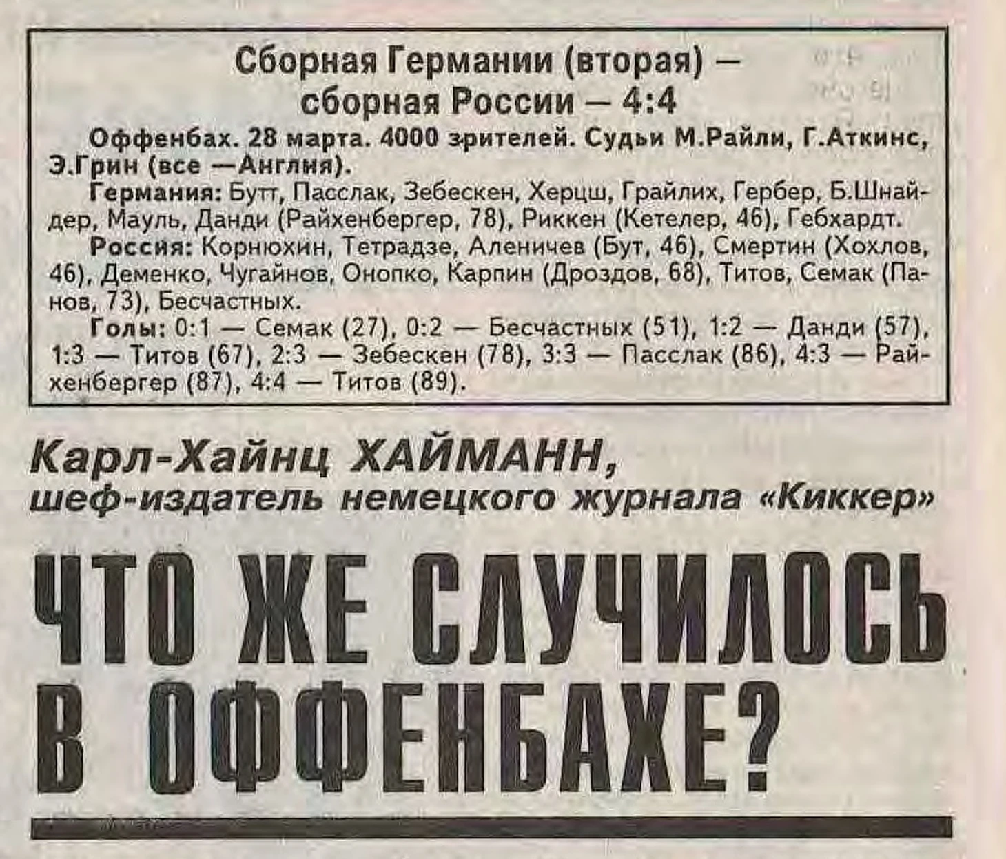 Это случилось 28 марта 2000 года. На стадионе «Биберер Берг» в городе Оффенбахе футболисты Олега Романцева встретились со сборной Германии. Но не с главной бундестим, а с ее второй командой.