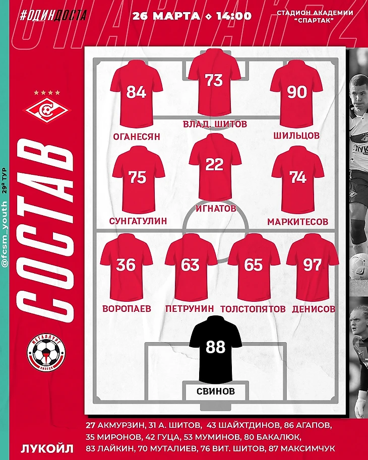 Состав. «Спартак-2» усилили три игрока из обоймы основного состава — Илья Свинов, Даниил Денисов и Михаил Игнатов. Причем для Игнатова, лучшего бомбардира второй команды в прошлом сезоне, это был вообще первый матч в ФНЛ в этом розыгрыше, а Денисов сыграл впервые в этом календарном году.