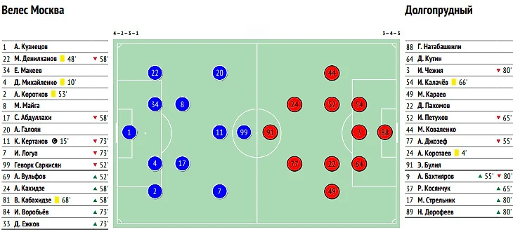«Велес» отреагировал на поражение в прошлом туре победой над «Олимп-Долгопрудным». Несколько опаснейших моментов удалось создать в первом тайме хозяевам, но гол случился после шикарного удара Кертанова в ситуации, которую опасным моментом назвать тяжело. Получив мяч перед чужой штрафной правее центра, полузащитник хозяев правой (!) ногой направил его по невероятной траектории в дальнюю от себя девятку! «Олимп-Долгопрудный» несколько раз ответил, однажды у него даже случился реальный голевой шанс, но им гости не воспользовались.