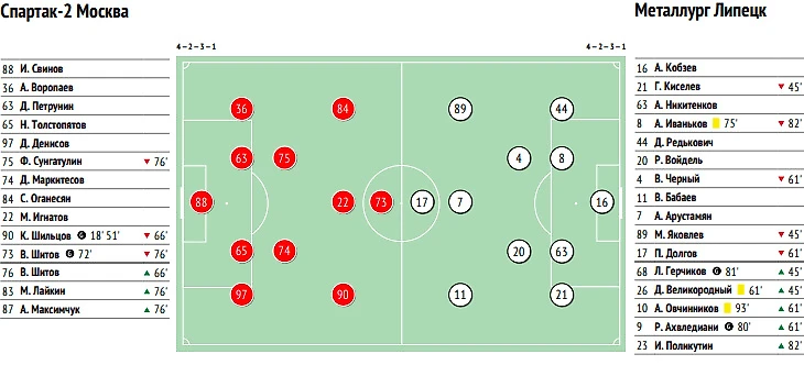 «Спартак-2» и «Металлург» сыграли в Москве матч-триллер, хотя по ходу поединка предугадать драматичное развитие событий было трудно. До перерыва хозяева смотрелись чуть убедительнее, но и липчане регулярно отвечали своими атаками. Самый лучший момент в составе «Металлурга» имел Бабаев, однако его удар отразил кипер красно-белых Свинов. Спартаковцы же забили после того, как пошел длинный заброс со своей половины поля на Шильцова, тот своевременно совершил рывок, выскочил на рандеву с голкипером Кобзевым и с правого края штрафной идеально пробил мимо него. Кроме Шильцова, у спартаковцев мог забить ещё и Игнатов, но там уже здорово сыграл Кобзев.