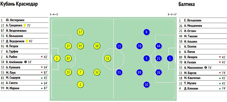 Во втором тайме «Балтика» изо всех сил старалась взломать оборону окопавшейся на своей половине поля «Кубани», но сумела сделать это только один раз – с пенальти, назначенного за игру рукой. Еще в двух-трёх случаях краснодарцев спас вратарь.