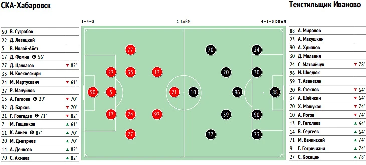 Игровой день начался с крупной победы «СКА-Хабаровск» над занимающим последнее место «Текстильщиком». В первом тайме огромное территориальное преимущество было у хозяев. Правда, острые моменты у ворот «Текстильщика» возникали очень редко, а единственный мяч был забит хозяевами после грубой ошибки резервного голкипера гостей. Он нерасчётливо вышел к линии штрафной после передачи из глубины поля, чем смутил своего же защитника Матвийчука, а хабаровчанин Гаглоев выскочил у него из-за спины, оказался первым на мяче, ушёл чуть в сторону и издевательски спокойно поразил пустые ворота.