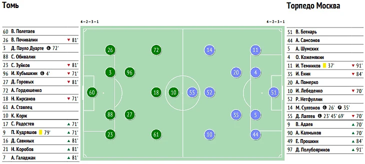Еще через девять минут Темников с правого фланга попытался подать в штрафную и попал точно в выставленную руку защитника томичей Дуарте. Пенальти чётко реализовал тот же Султонов. Когда же шли последние секунды первого тайма, Лебеденко очередной передачей отправил в чужую штрафную Енина, он выкатил мяч на Лаптева, и форвард «Торпедо» спокойно метров с восьми расстрелял ворота «Томи».