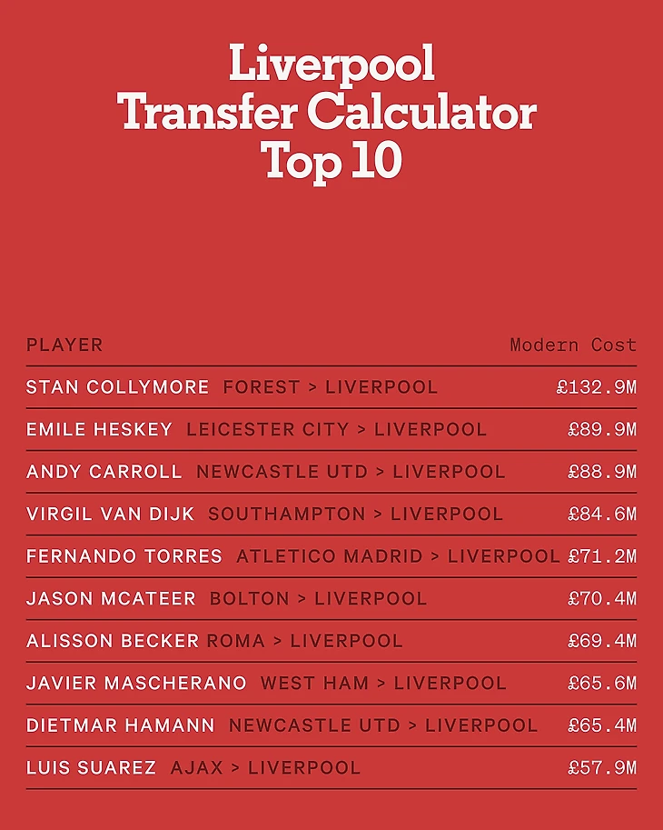 По нашим подсчетам, это делает Коллимора самым дорогостоящим подписанием на «Энфилде» из всех. Когда он перешел из «Ноттингем Форест» в 1995 году, это случилось за £8,5 млн. В то время это был рекордный гонорар в Великобритании, так что, возможно, неудивительно, что сегодня он также будет значительным — учитывая инфляцию на футбольном рынке с тех пор, и теперь эту сумму можно переформатировать в £132,9 млн.