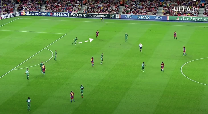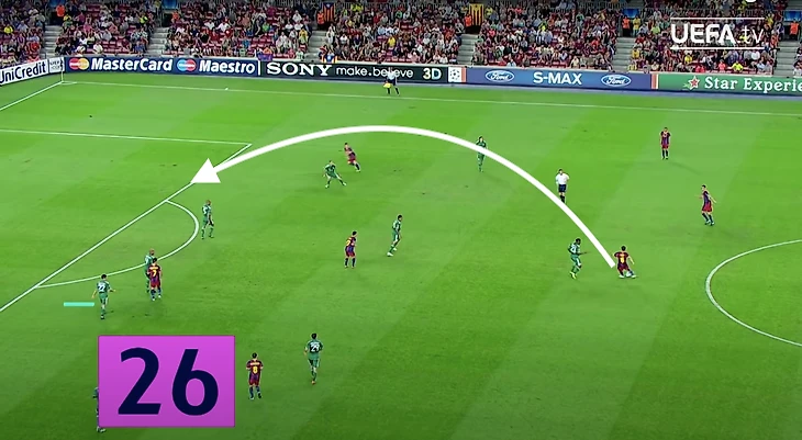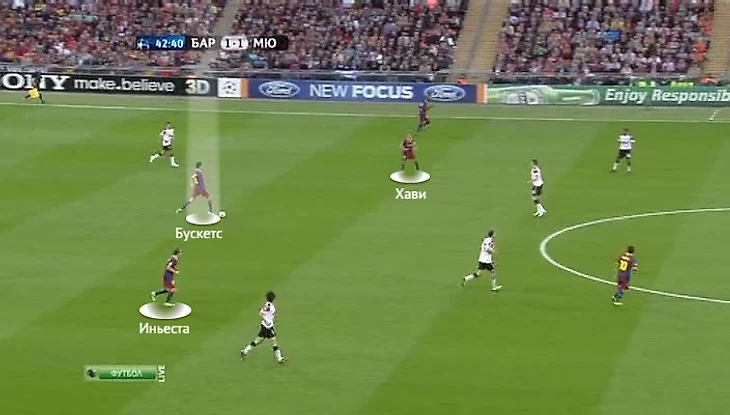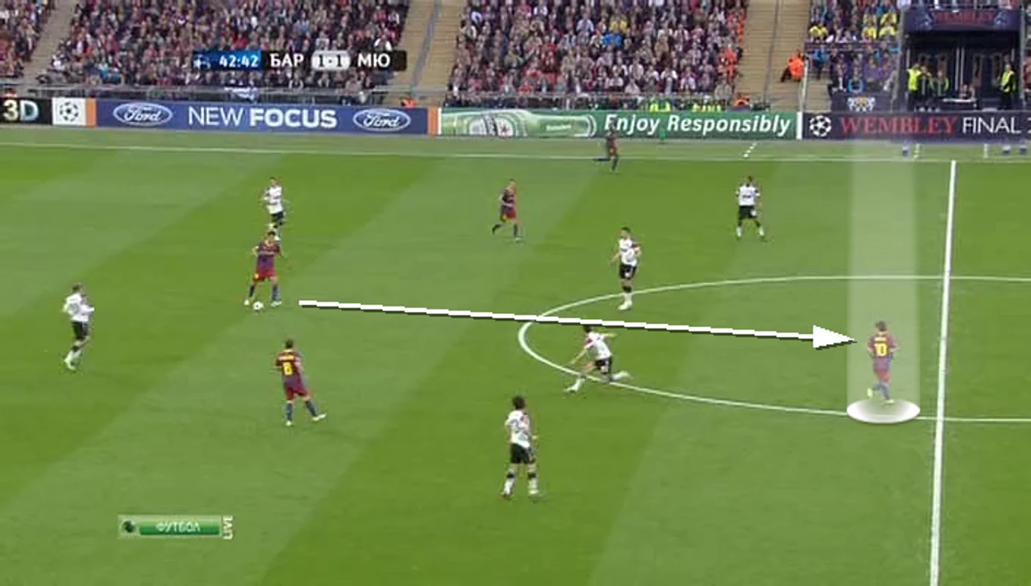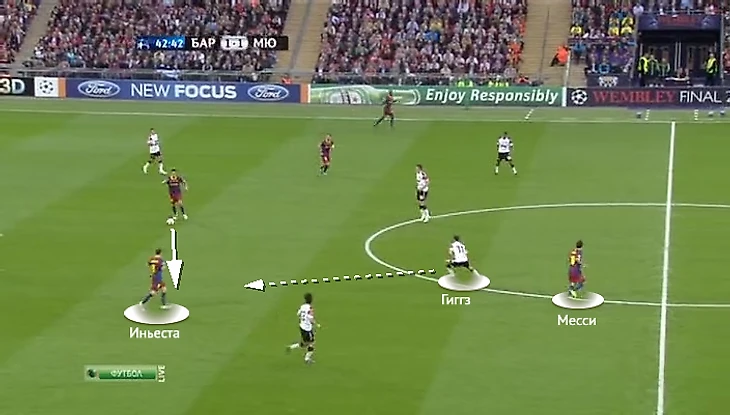 Вместо этого Серджи только показывает, что будет пасовать на Иньесту. На это реагирует находящийся рядом с Лео Месси Райан Гиггз. Валлиец начинает движение к Иньесте и заодно оставляет Месси свободным: