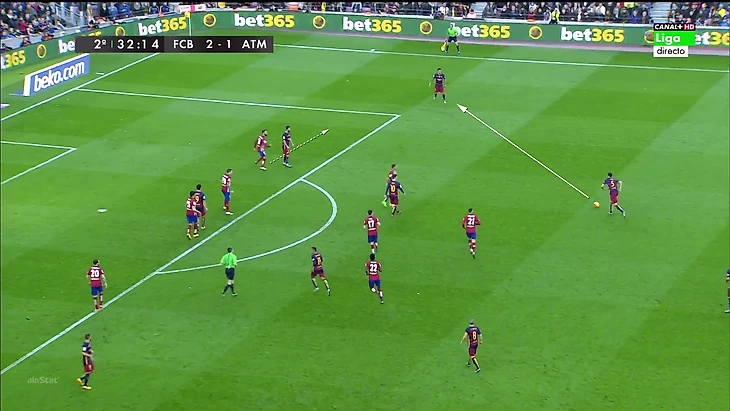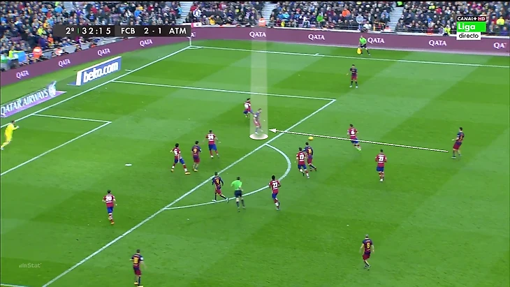 А это уже пример завершающей стадии от Бускетса – из игры с «Атлетико» в сезоне-2015/16. Он снова подключает любимый обманный прием – разворачивает корпус и показывает, что отдаст на правый фланг (там свободен Серджи Роберто). На это движение купился левый защитник «Атлетико» Хесус Гамес – он оставляет Арду Турана и выдвигается на фланг: