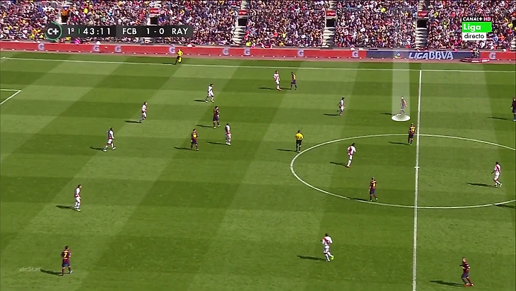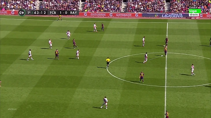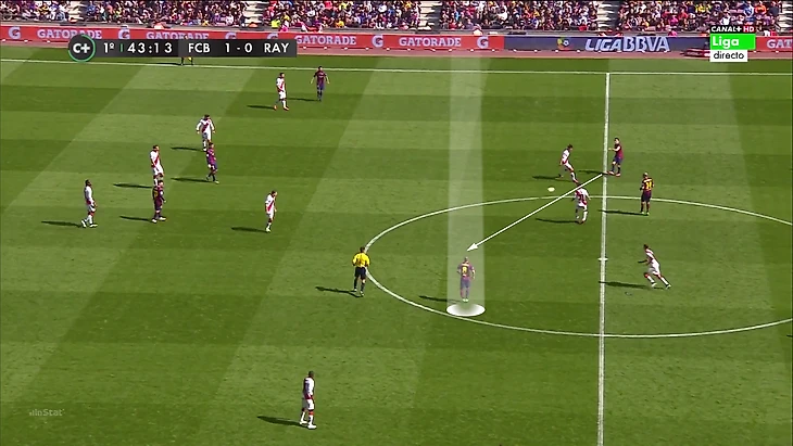Вот пример из матча «Барсы» с «Райо» в сезоне-2014/15. Хави с мячом, впереди нет доступных вариантов для передачи – партнеры либо прикрыты соперниками, либо до них не довести мяч. Рядом только Хавьер Маскерано, но он всего в паре метров – пасоваться с ним нет смысла: