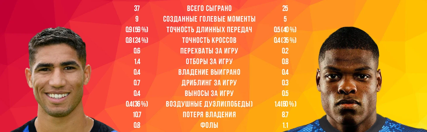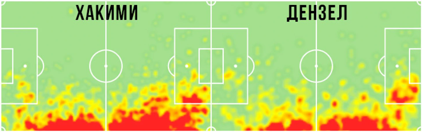 Первым по значимости для фанатов «Интернационале» был вопрос: «А сможет ли Дензел заменить Хакими?». Ашраф является одним из лучших латералей мира, поэтому заменить его в полном объеме невозможно. Однако, «Интер» приобрел «младшего брата» Хакими: если мы посмотрим на тепловую карту, то станет ясно, что Дензел проделывает столь же большой объем беговой работы, как и Хакими. А вот статистические показатели голландского защитника оставляют желать лучшего… он проигрывает почти по всем показателям: