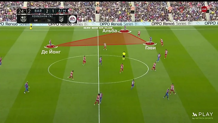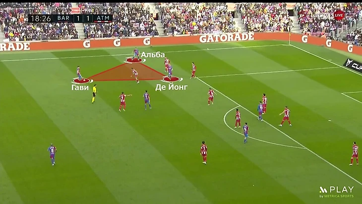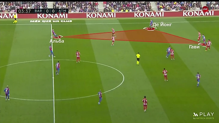 Разобравшись с цифрами, давайте посмотрим, из чего они рождаются – погрузимся в матчи. В тексте про все изменения в «Барсе» при Хави описан механизм работы двух флангов. Они разные: справа упор на изоляции и дриблеров, а слева – на комбинации и ротации игроков в треугольнике. В данном случае нас интересует только левая сторона (именно так – теперь Жорди играет там, а не только на фланге), но для полноты картины можете заглянуть в тот материал.