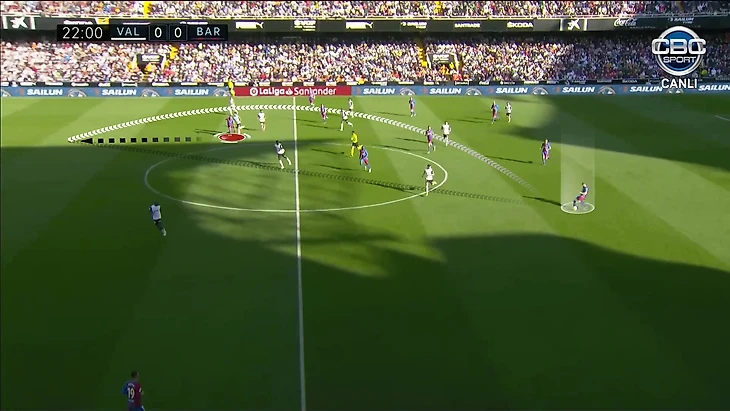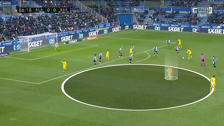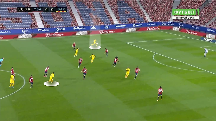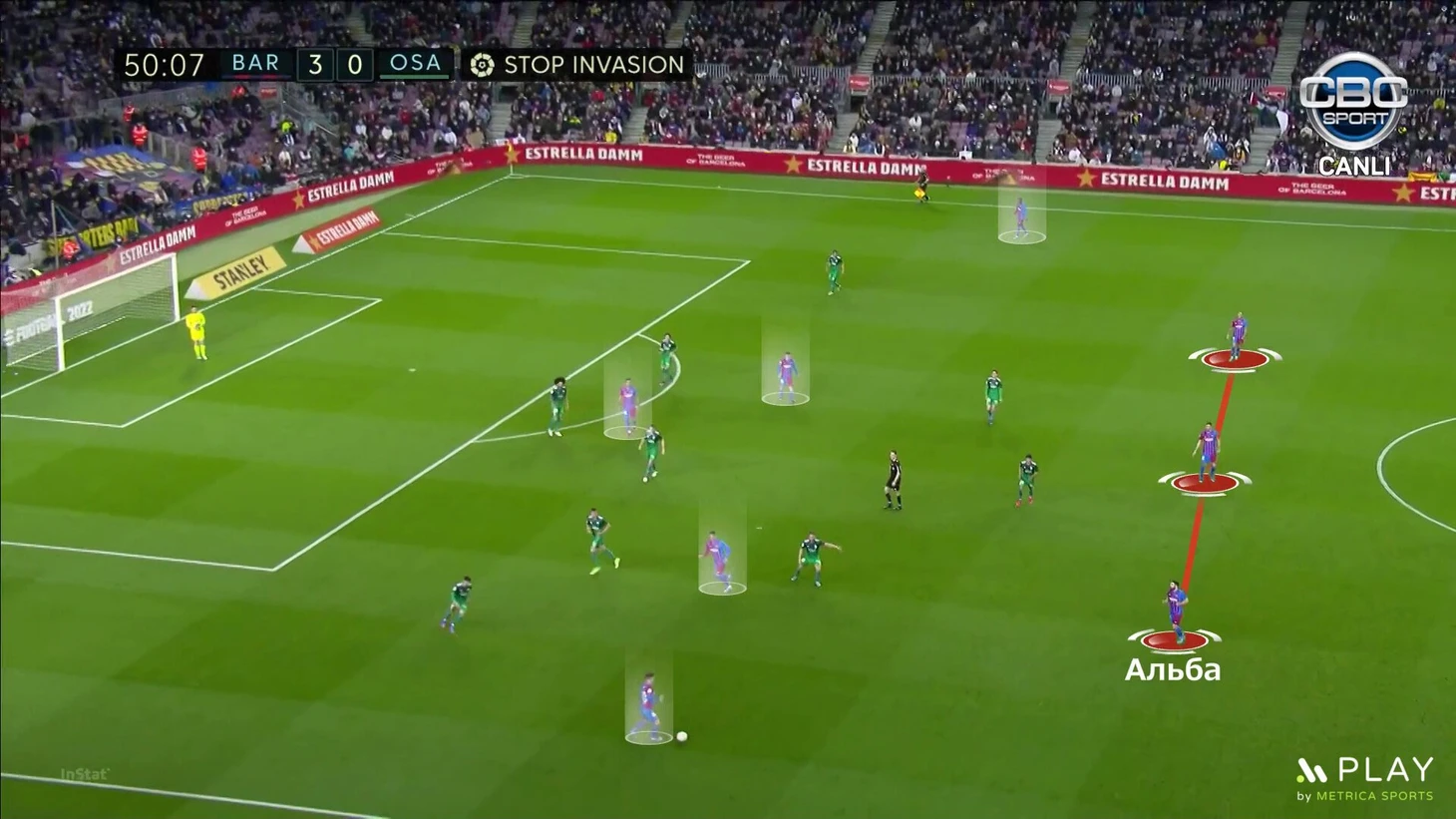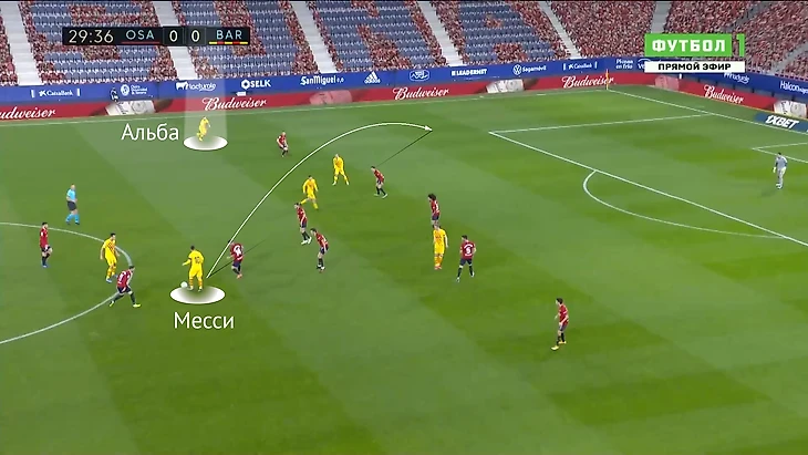 Рассмотрим на конкретном примере из прошлого сезона. В матче с «Осасуной» в Ла Лиге Лео окружен тремя соперниками. Фланг Альбы перекрыт – так что Лео не спешит и выжидает.