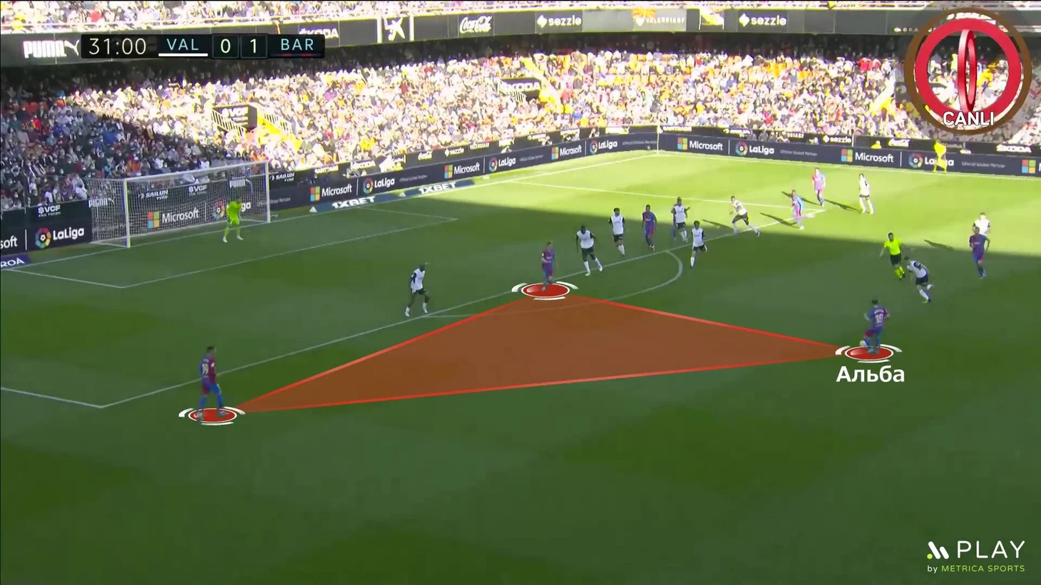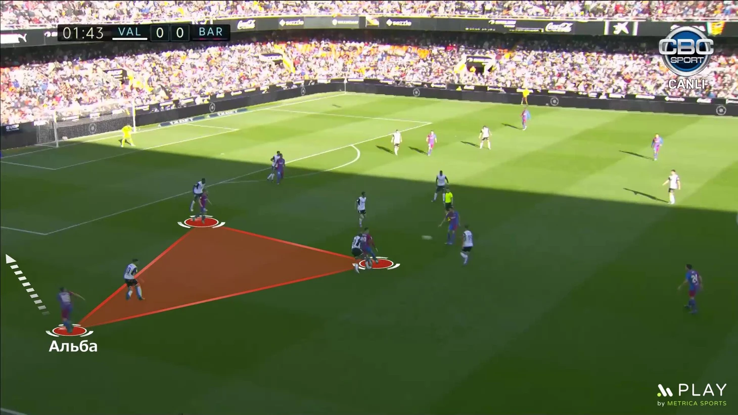 У чужих ворот Альбе может достаться любая роль в рамках треугольника, в котором также задействован вингер (например, Ферран Торрес) и левый центральный полузащитник (например, Френки де Йонг). Задача – поддерживать треугольник, в котором всегда заполняется и фланг, и полуфланг. Порой смена позиций в таком треугольнике приводит к созиданию Альбы из чужой опорной: