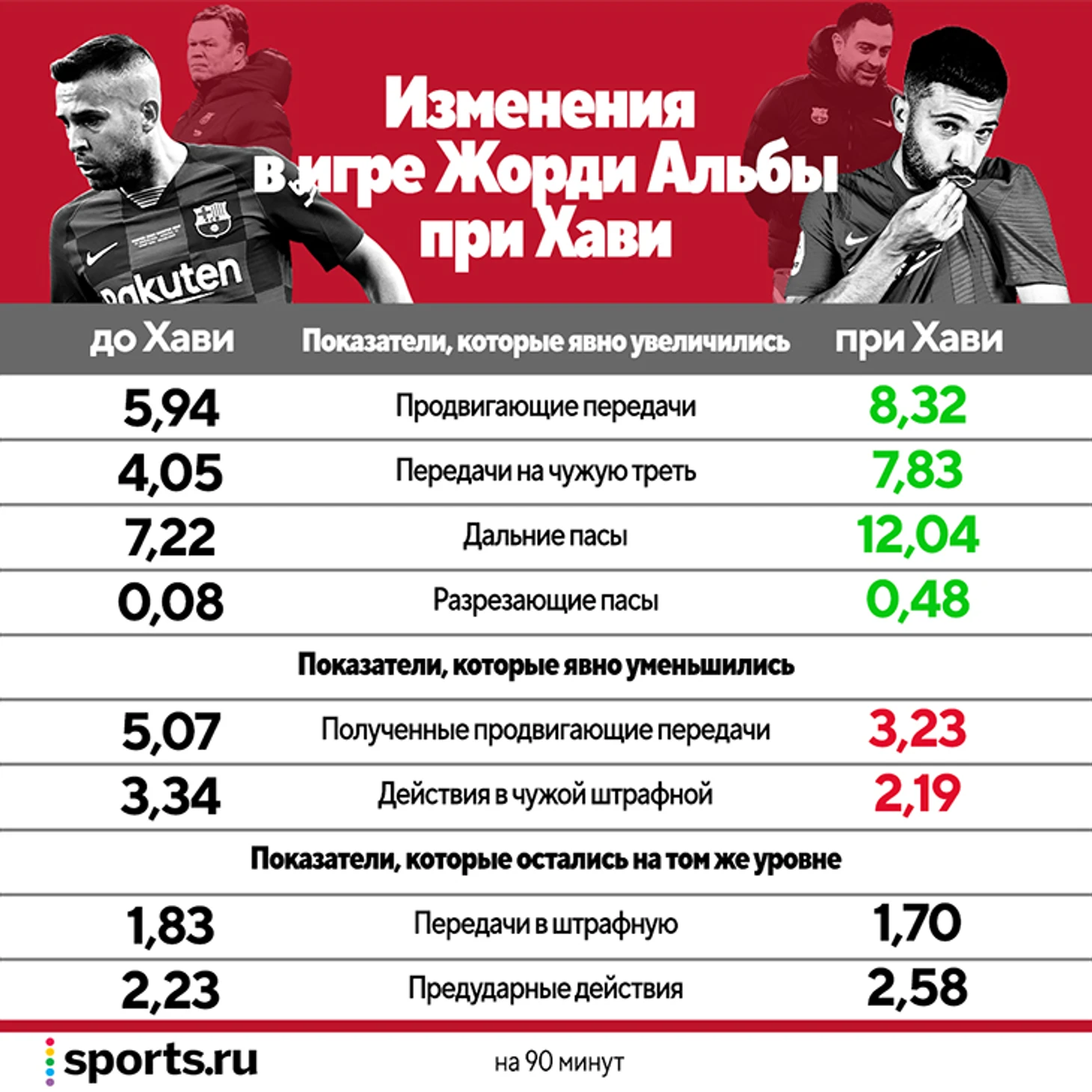 Ряд показателей, которые держались на одном стабильном уровне последние четыре сезона (берем такую выборку, потому что по ним есть в том числе продвинутая статистика), резко выросли или сократились, что напрямую связано с новыми функциями. Жорди прошел категорически интересную трансформацию. Из атакующего крайка Альба стал многопрофильным игроком левой части поля: