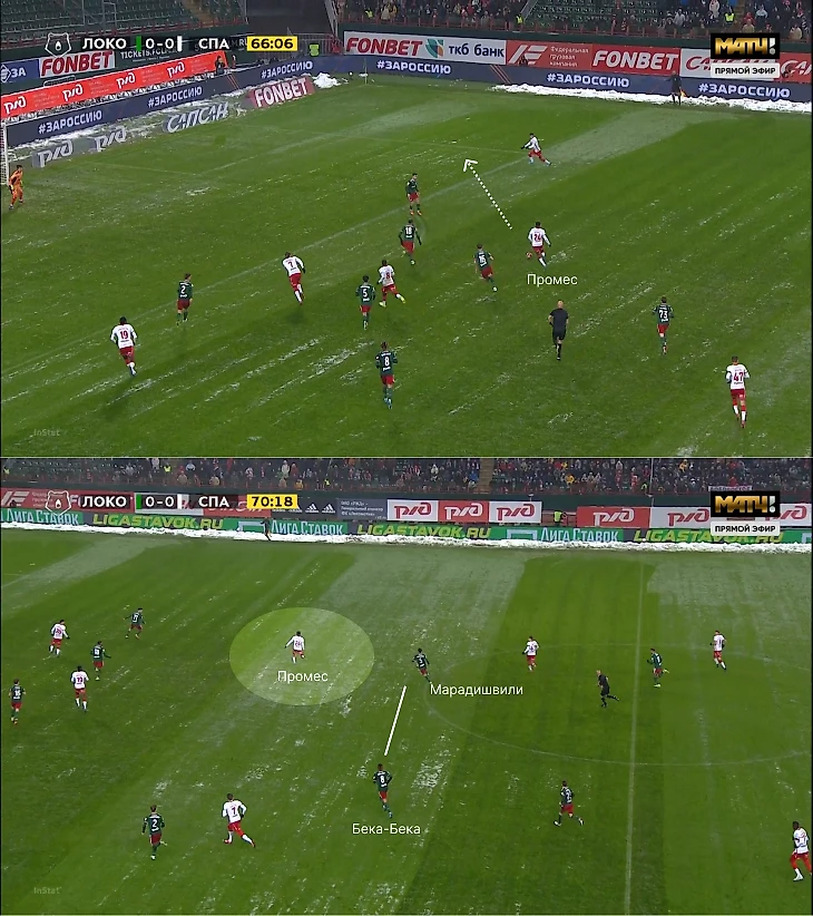 Первым поменялся Ваноли: с выходом Соболева «Спартак» перешел на 3-5-2 (Промес сыграл десятку). Сначала задумка неплохо работала: Квинси открывался за спинами центральных полузащитников и разогнал момент с опасным прострелом Хлусевича (Худяков выбил) плюс поучаствовал в супершансе Соболева (Живоглядов вынес с ленточки).