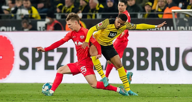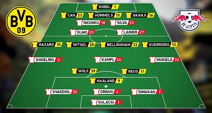 Эти результаты означали только то, что в центральной игре тура субботним вечером «РБ Лейпцигу» на стадионе «Сигнал Идуна Парк» в Дортмунде нужна была только победа. Но соперником «быков» был не кто-нибудь, а местная «Боруссия», которая впервые с зимы 2020 года сыграла при полном стадионе. Обе команды играли по схеме с тремя защитниками (Мануэль Аканджи, Матс Хуммельс и Эмре Джан – у черно-желтых, Мохамед Симакан, Вилли Орбан и Йошко Гвардиол – у Лейпцига) и с широкой линией полузащиты. С той лишь разницей, что у «Боруссии» в середине поля было 4 полузащитника (Рафаэль Геррейро, Джуд Беллингем, Аксель Витсель и Торган Азар) и два атакующих игрока (Мариус Вольф и Марко Ройс) с Эрлингом Холандом на острие атаки. А у «РБ Лейпцига» три игрока в середине поля (Анхелиньо, Кевин Кампль и Норди Мукиеле), два разноплановых атакующих игрока (Конрад Ляймер и Дани Ольмо) и два нападающих (Кристофер Нкунку и Андре Силва). Когда мяч был у Дортмунда, «быки» очень часто увеличивали линию обороны до пяти человек. После того, как гости добились комфортной разницы в счете, они окончательно перешли на схему 5-3-2.