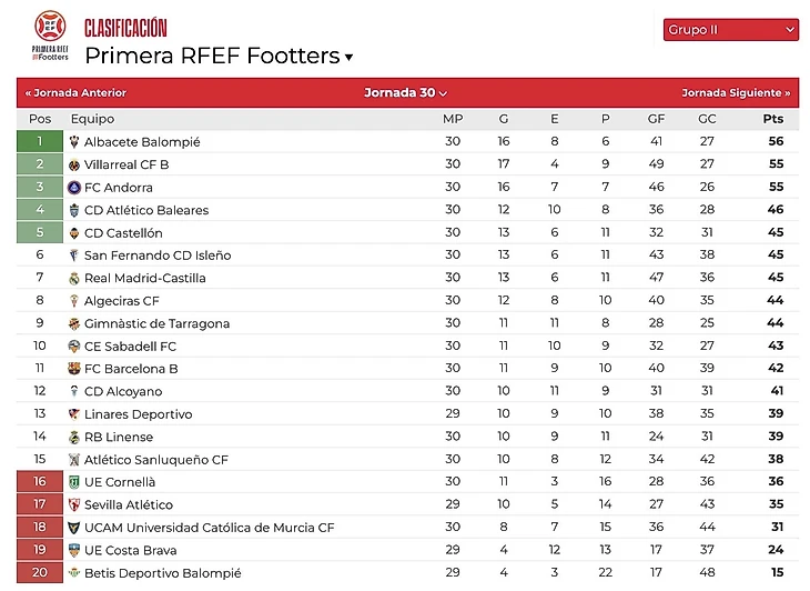 Примечание: при равенстве очков в первую очередь учитываются очные встречи, поэтому Кастилья должна быть выше Сан Фернандо, но в таблице это будет учитываться по итогам чемпионата.