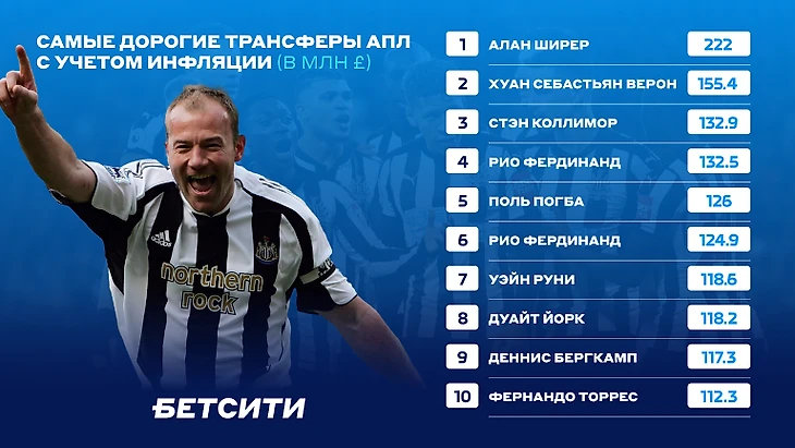 Алан Ширер. Перешел из «Блэкберн Роверс» в «Ньюкасл Юнайтед» в 1996 году. Сумма трансфера: тогда — 15 млн фунтов, сейчас — 222 млн;