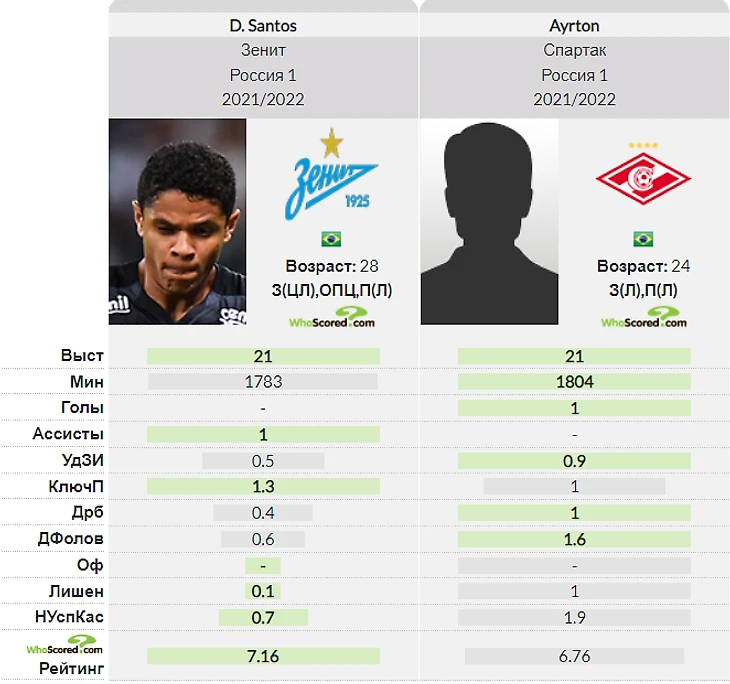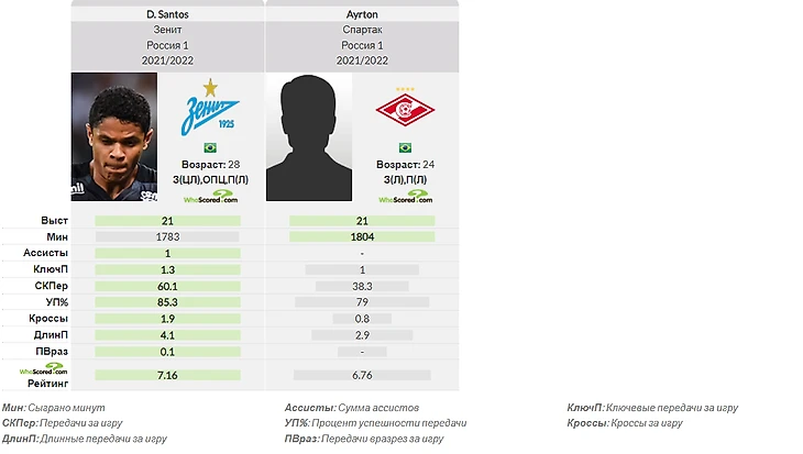 Тут комментарии не нужны. Айртон превзошел оппонента в таком важном показателе, как сыгранные минуты. Справедливости ради скажу, что Айртона реже обводят. Не хочется ничего говорить о действиях бразильского защитника в обороне, потому что и говорить то тут не о чем... Кто смотрел матчи и сами все понимают. А кто не смотрел, тому сильно повезло