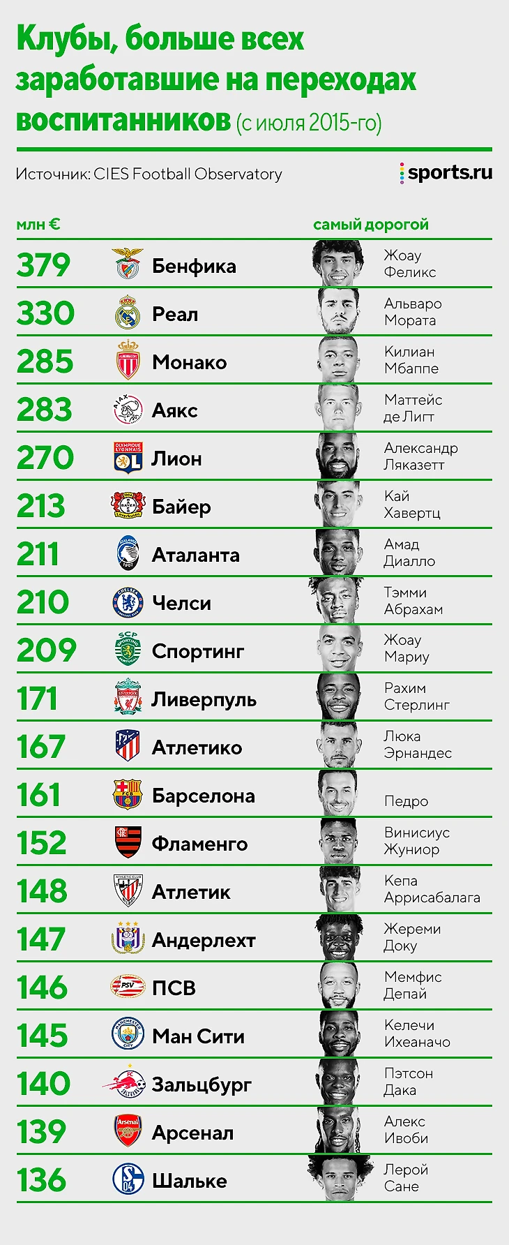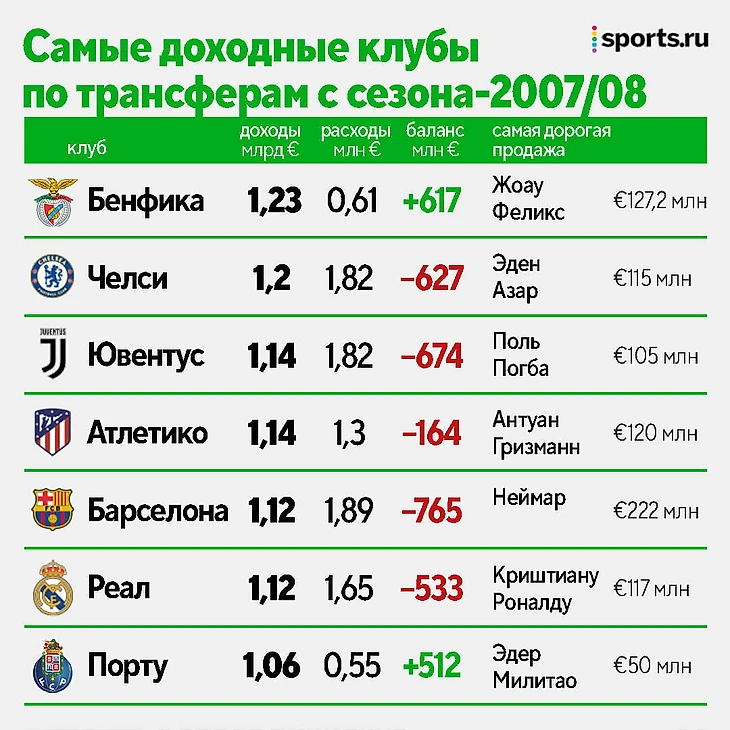 Если посмотреть трансферный баланс европейских клубов за последние 15 лет, то выяснится, что лучше всех он у «Бенфики» (+616,78 млн) и «Порту» (511,65 млн). На девятом месте расположился «Спортинг» (228,83 млн). По чистым трансферным доходам (1,2 миллиарда евро за 15 лет) «Бенфика» тоже лидирует. Лиссабонцы обходят «Челси», «Юве», «Атлетико», «Барсу», «Реал» и тот же «Порту».