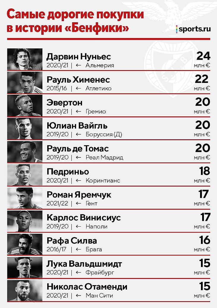 К слову, предыдущий рекорд «Бенфики» по трансферу на вход держался 5 лет. Тогда португальцы купили Рауля Хименеса за 22 миллиона евро (а затем перепродали за 38 млн).